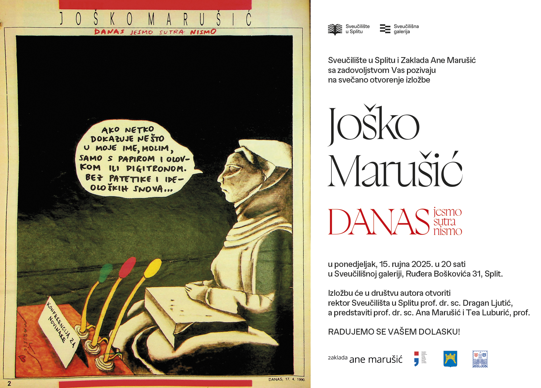 Svečano otvorenje izložbe Joška Marušića“Danas jesmo, sutra nismo” održat će se u ponedjeljak, 15. rujna 2025., u 20 sati u Sveučilišnoj galeriji, Ruđera Boškovića 31, Split.Izložbu će otvoriti rektor Sveučilišta u Splitu prof. dr. sc. Dragan Ljutić, a predstaviti prof. dr. sc. Ana Marušić i Tea Luburić, prof.Ulaz je slobodan.Radujemo se Vašem dolasku!