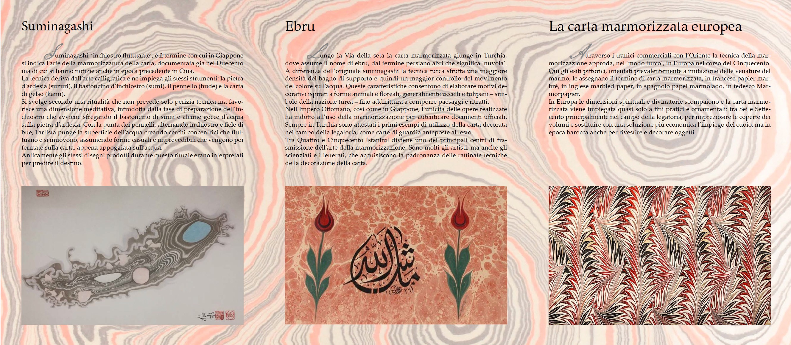Izložba donosi povijesni pregled tehnike mramoriranja papira, koja potječe iz Dalekog Istoka, proširila se Perzijom i Turskom te krajem 16. stoljeća stigla i u Europu. Posjetitelji izložbe mogu vidjeti raznovrsne uzorke i predmete dekorirane ovom tehnikom, te otkriti njezinu primjenu kroz stoljeća – od meditativne prakse i proricanja sudbine do ukrašavanja luksuznih korica knjiga.