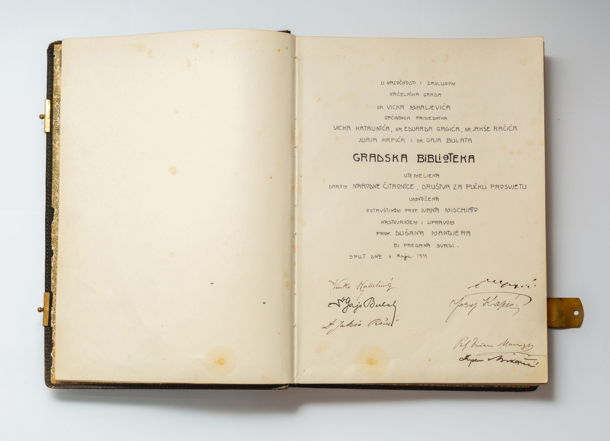 Užežin Sv. Duje, dana 6. svibnja 1911. godine svečano je, zaslugom načelnika grada dr. Vicka Mihaljevića, općinskog upraviteljstva i marom prof. Dušana Mangera, na prvom katu palače Bernardi, u predjelu Pistura, otvorena Gradska biblioteka – danas Sveučilišna knjižnica u Splitu.