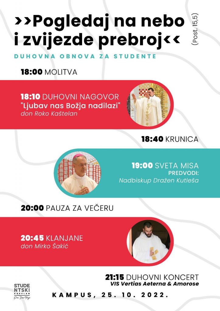 Nadbiskupija Splitsko – makarska, Ured za pastoral mladih Splitsko-makarske nadbiskupije u suradnji sa Sveučilištem u Splitu i Studentskim Centrom Split, organiziraju duhovnu obnovu za studente i mlade „Pogledaj na nebo i zvijezde prebroj“ koja će se održati dana 25 listopada 2022. u studentskom domu dr. Franjo Tuđman.
