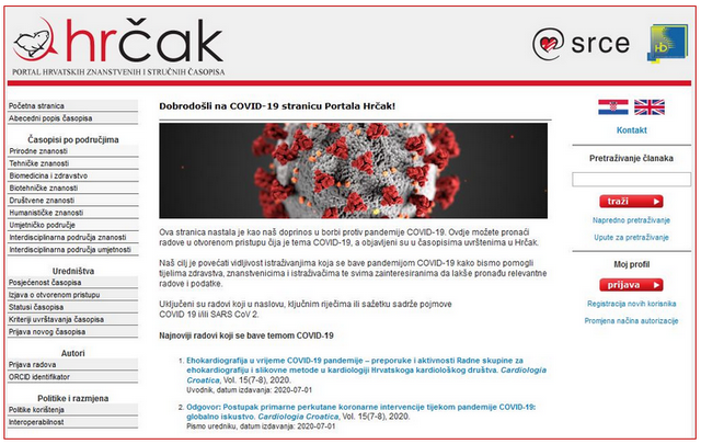 Na portalu hrvatskih znanstvenih i stručnih časopisa Hrčak implementirana je nova COVID-19 stranica koja okuplja radove vezane uz temu COVID-19 iz različitih znanstvenih područja, a objavljeni su u časopisima uvrštenima u Hrčak.