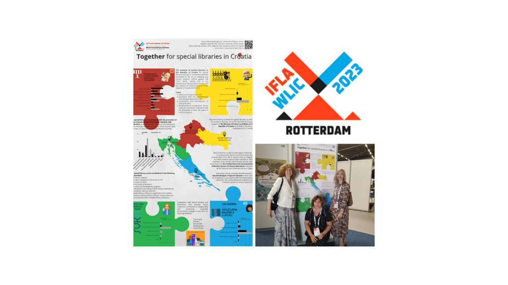 Na svjetskom knjižničarskom i informacijskom kongresu Međunarodnoga saveza knjižničarskih društava i ustanova (IFLA WLIC 2023), koji je krajem kolovoza održan u Rotterdamu u Nizozemskoj, posterskim izlaganjem Together for special libraries in Croatia, voditeljice sveučilišnih matičnih razvojnih službi Sanja Heberling Dragičević iz Sveučilišne knjižnice Rijeka, dr. sc. Svjetlana Mokriš iz Gradske i sveučilišne knjižnice Osijek, dr. sc. Breza Šalamon-Cindori iz Nacionalne i sveučilišne knjižnice u Zagrebu te Irena Urem iz Sveučilišne knjižnice u Splitu predstavile su rad i sustav matičnih razvojnih službi na primjeru specijalnih knjižnica Republike Hrvatske.