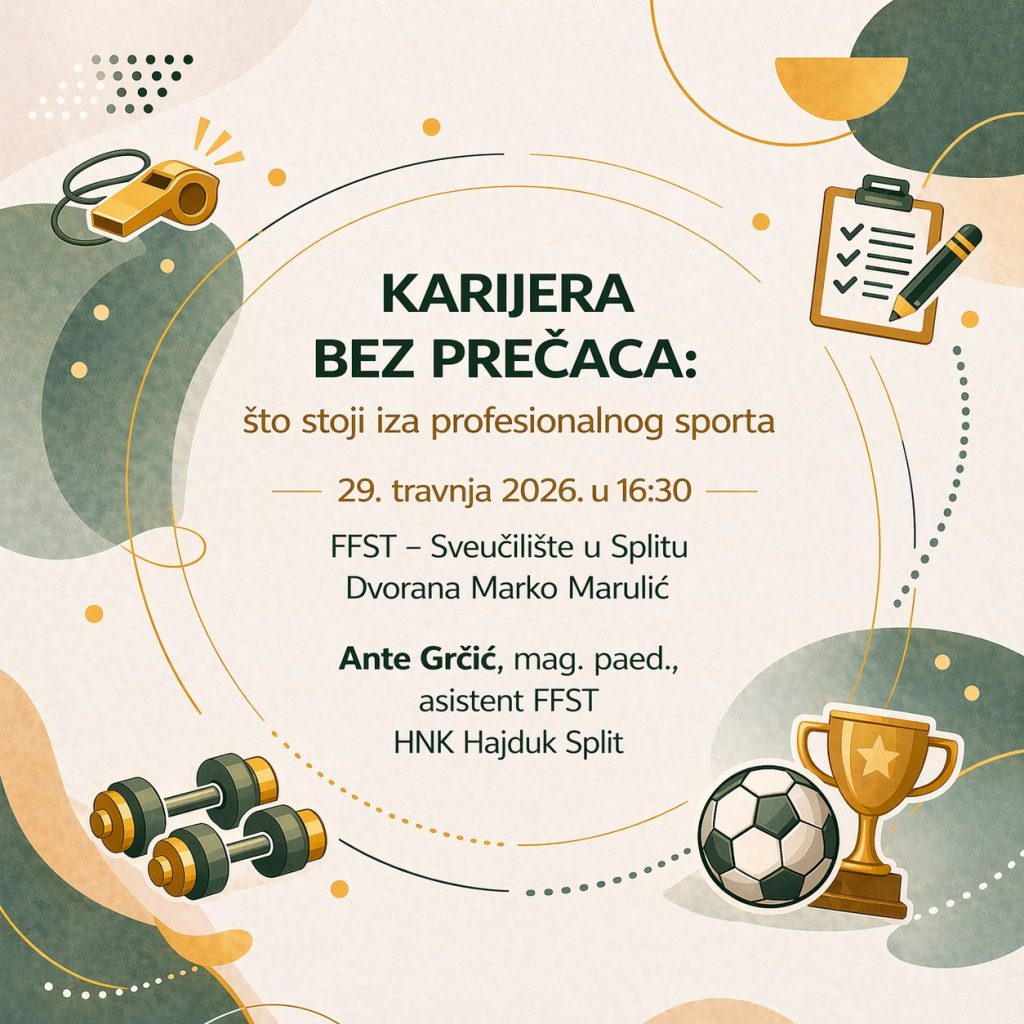 U organizaciji Centra za planiranje i razvoj karijera Filozofskog fakulteta Split i Odsjeka za savjetovanja i podršku studenata Sveučilišta u Splitu, u srijedu 29. travnja 2026. godine s početkom u 16:30 sati, u dvorani Marko Marulić na FFST-u, Poljička 35, održat će se panel rasprava „Karijera bez prečaca: što stoji iza profesionalnog sporta”. Gosti panel rasprave bit će profesionalni nogometaši HNK Hajduk Split, koji će sa studentima i zainteresiranom javnošću podijeliti svoja iskustva o razvoju sportske karijere, pritiscima profesionalnog sporta i svakodnevici koja stoji iza uspjeha vidljivog na terenu.