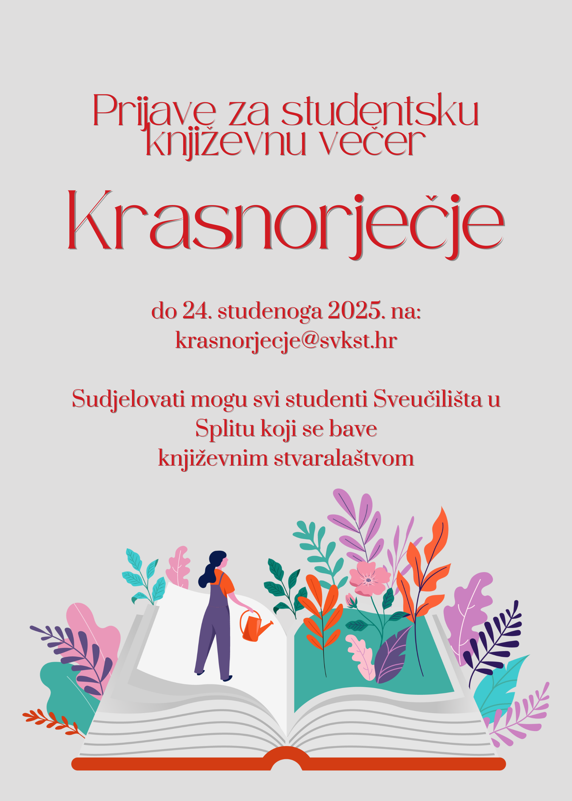 Dakle, pozivamo studente zainteresirane za sudjelovanje na ovogodišnjoj književnoj večeri (koja će se održati sredinom prosinca) da do 24. studenoga 2025. dostave svoje pjesme ili kraće prozne uratke na adresu: krasnorjecje@svkst.hr, uz naznaku predmeta: Krasnorječje.