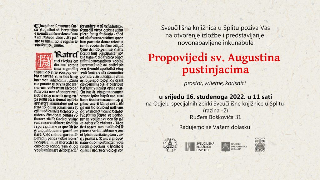 Uoči skorog obilježavanja 120 godina od osnutka splitska je Sveučilišna knjižnica – zahvaljujući susretljivosti gospođe Marije Rapanić i posredovanjem prof. dr. sc. Ivana Basića, obogatila trezore još jednom inkunabulom – Propovijedima sv. Augustina pustinjacima (Sermones sancti Augustini ad heremitas), objavljenom 1495. u Veneciji, kod Simona Bevilaquae. Djela sv. Augustina (354. – 430.) jednog od najznamenitijih latinskih crkvenih otaca i velikog zapadnog crkvenog učitelja, prema navodima inkunabuliste prof. Josipa Badalića, uz djela sv. Jerolima, najbrojnija su među inkunabulama sačuvanim na tlu Hrvatske.