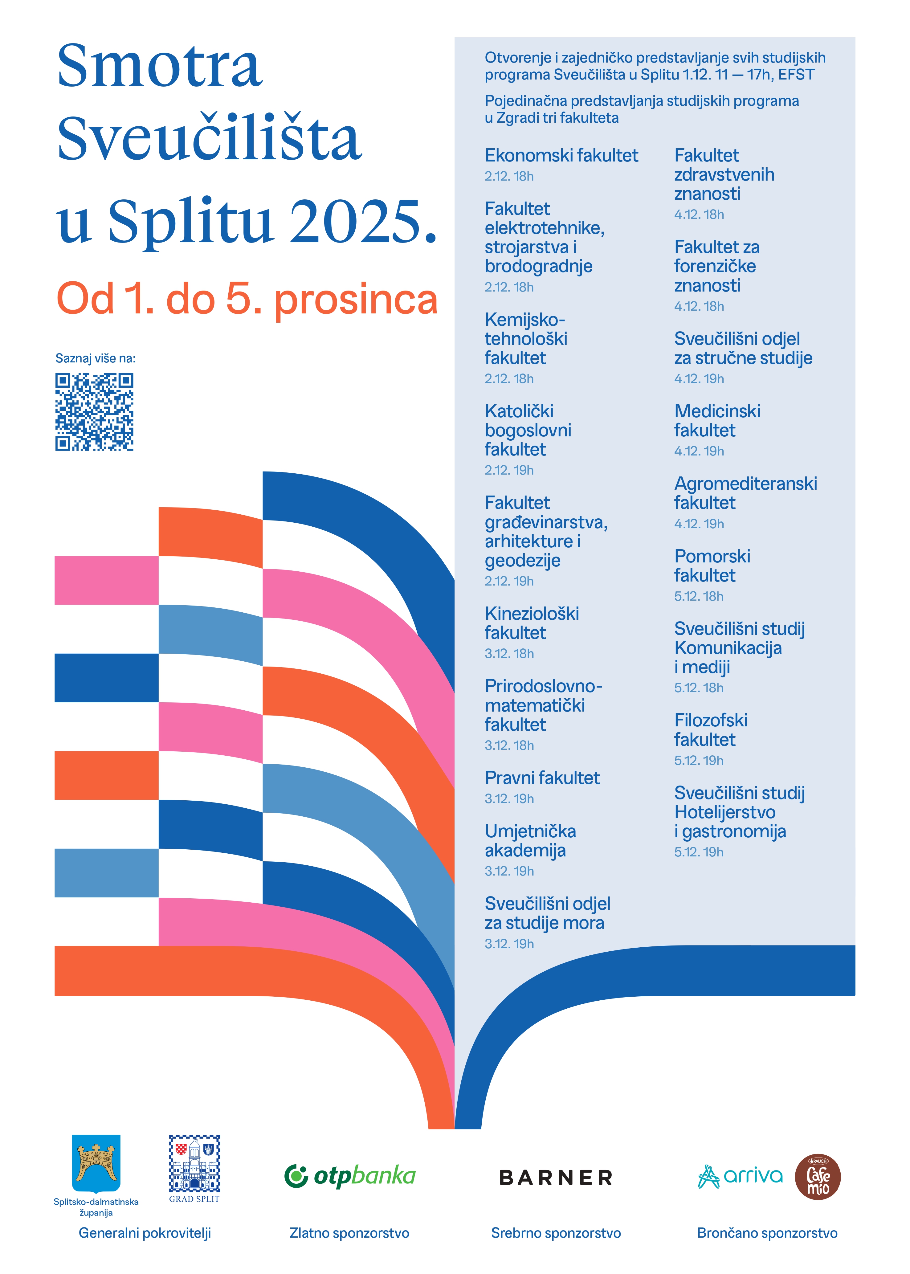 Smotra Sveučilišta u Splitu održat će se od 1. do 5. prosinca 2025. u prostoru Kampusa, tradicionalno u sklopu adventskih događanja. Ovogodišnji program namijenjen je svim srednjoškolcima, a posebno maturantima koji se pripremaju za odabir studija.