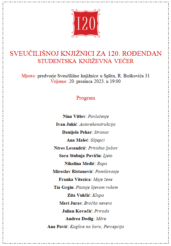 Sveučilišnoj knjižnici za 120. rođendan – STUDENTSKA KNJIŽEVNA VEČER Dec 19,2023 Comments Off on Sveučilišnoj knjižnici za 120. rođendan – STUDENTSKA KNJIŽEVNA VEČER NOVOSTI