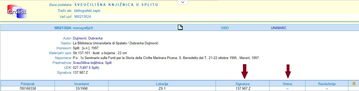 Osim na ime autora i naslov publikacije, pri naručivanju građe važno je obratiti pozornost na signaturu, koja označava mjesto knjige u knjižnici. Isto tako, korisno je provjeriti i status, koji upućuje na to je li primjerak slobodan za korištenje.